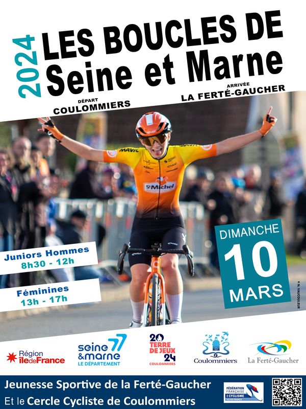 Parcours : Départ fictif : parcours en centre-ville de COULOMMIERS (2,8 km) Puis course en ligne de 89,6 km : D402, à droite D19, DOUE, à gauche D37, Mauroy, à gauche D204, Les Grands Montgoins, à droite D31, SAINT CYR SUR MORIN, SAINT OUEN SUR MORIN, Busserolles, ORLY SUR MORIN, à droite VC, à gauche D68, côte de Gibraltar (km 26,4 – 2,1 km à 5,1 %), REBAIS, à gauche D204, à gauche D222, à gauche D55, LA TRETOIRE, Coton, Bécherelle, à droite D31, SABLONNIÈRES, à droite D222, La Chenée, côte de la Chenée (km 43,8 – 1,7 km à 4,5 %), à gauche D6, BELLOT, à droite rue des Avosnes, côte de Launoy Brûlé (km 47,5 – 1,1 km à 8,2 %), Launoy Brûlé, à droite D42, SAINT LEGER, REBAIS, à droite D204, à droite D222, à gauche D55, LA TRETOIRE, Coton, Bécherelle, à droite D31, SABLONNIÈRES, à droite D222, La Chenée, côte de la Chenée (km 67,6 – 1,7 km à 4,5 %), à gauche D6, BELLOT, à droite rue des Avosnes, côte de Launoy Brûlé (km 71,3 – 1,1 km à 8,2 %), Launoy Brûlé, à gauche D42, Doucy, à droite D46, La Frévillard, LA FERTÉ GAUCHER, à gauche D215 (entrée sur le circuit final), à droite VC, Coupigny, à droite D14, SAINT MARTIN DES CHAMPS, LA FERTÉ GAUCHER, rue Ernest Delbet, à droite avenue du Général Leclerc, à gauche rue André Maginot, à gauche rue du Champ de Foire, à droite rue du Docteur Cochot, avenue de Rebais Puis circuit final de 10,2 km à parcourir 2 fois : avenue de Rebais, à droite rue Robert Legravérend, à gauche avenue du Général Leclerc, à droite rue Henri Dunant, D215, à droite VC, Coupigny, à droite D14, SAINT MARTIN DES CHAMPS, LA FERTÉ GAUCHER, rue Ernest Delbet, à droite avenue du Général Leclerc, à gauche rue André Maginot, à gauche rue du Champ de Foire, à droite rue du Docteur Cochot, avenue de Rebais Distance totale : 110 km