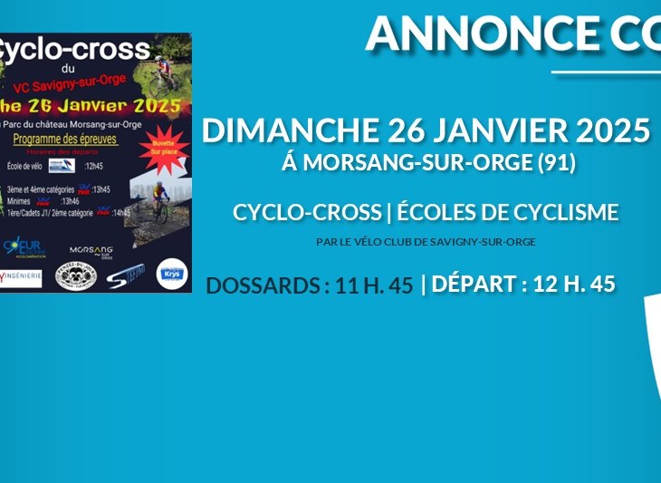 CYCLO-CROSSSouvenir Christelle BredardCatégories : U7, U9, U11, U13Dossards : 10:30 Mairie de Dourdan Esplanade Jean Moulin DOURDANHeure…