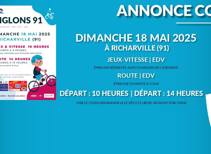 ÉPREUVE RÉSERVÉE AUX COUREURS ESSONNIENS ROUTE – JEUX – VITESSECatégories : U7, U9, U11, U13 Dossards…