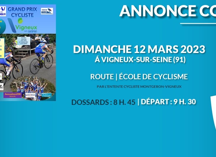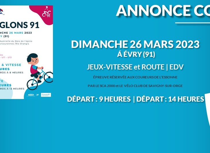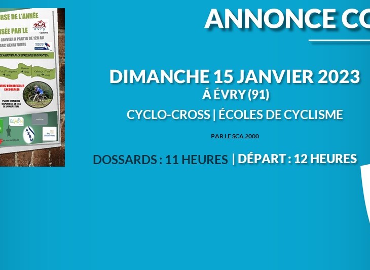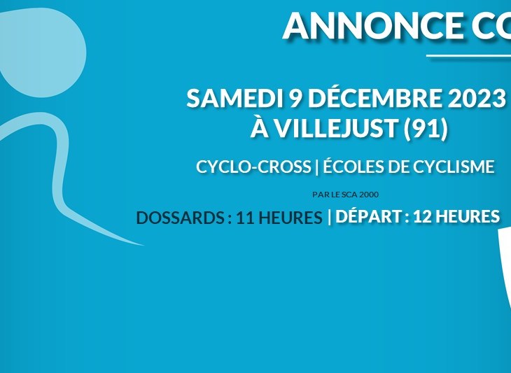 CYCLO CROSS D’EVRYCatégories : Prélicenciés, Poussins, Pupilles, BenjaminsCatégories : U7, U9, U11, U13 Dossards : 11 heures…